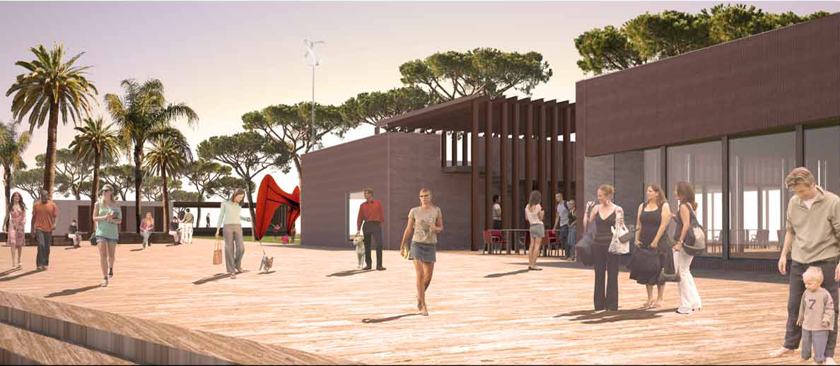 L’idea progettuale nasce ricercando accuratamente un collegamento forte con la storia e con le potenzialità di questi luoghi. Gli elementi preesistenti e la conformazione naturale del luogo ci hanno suggerito in maniera molto spontanea la creazione di due direttrici principali su cui basare lo sviluppo del parco e delle attività che in esso si svolgono. Schematizzando, potremmo dire che il progetto si sviluppa da ovest verso est, attraverso un percorso pedonale che parte dal Ristorante la Bussola e, giungendo ai piedi del Fronte Fortificato, penetra al suo interno e continua verso il Parco delle Mura. Questo percorso è intersecato da un asse sud-nord che percorre Via Marconi, entra nel Parco, e si apre in un cono ottico che, per sua conformazione naturale, si trasforma in un punto panoramico a ridosso della spiaggia delle Ghiaie verso il mare. Su queste due direttrici fondamentali si articola il progetto del Parco e del Lungomare, in un continuum di interazione flessibile tra gli spazi verdi, i giochi dei bambini, le mostre di arte, i luoghi di ritrovo, le feste e il costruito della città vecchia che domina dall’alto. E’ questo è infatti l’obiettivo più importante che è stato perseguito: integrare tra loro tutti gli elementi presenti all’interno della zona di progetto e allo stesso tempo inserire e collegare la zona di progetto con l’abitato circostante e la parte della città storica.